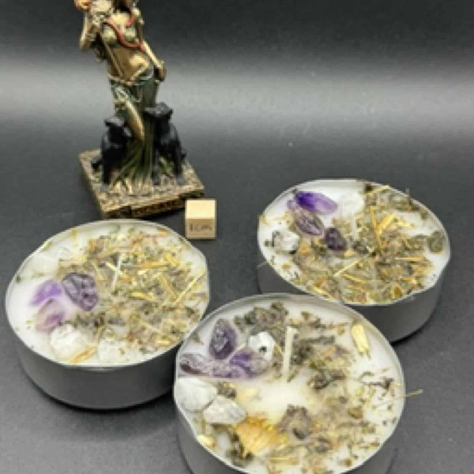 Tea lights infused with Hecate’s herbs and crystal chips (amethyst and rainbow moonstone). Ideal for meditations, divination, or gentle altar work when a full spell candle isn’t needed.